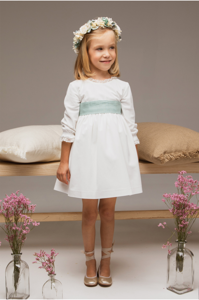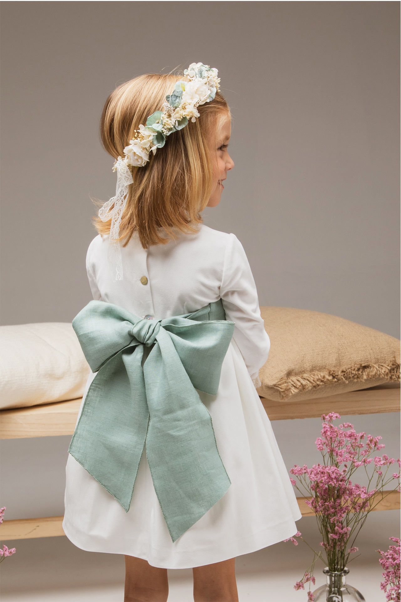 Vestido de terciopelo marfil rematado con puntilla en mangas y escote, lazada en lino aguamarina.