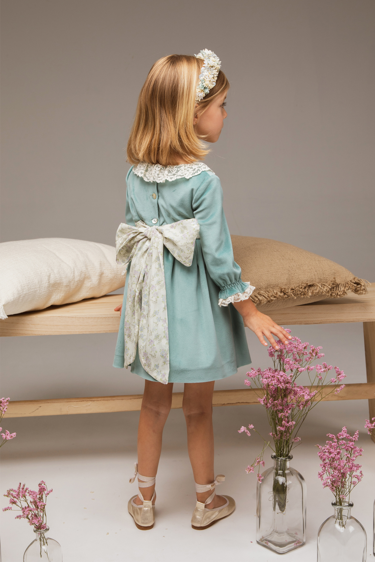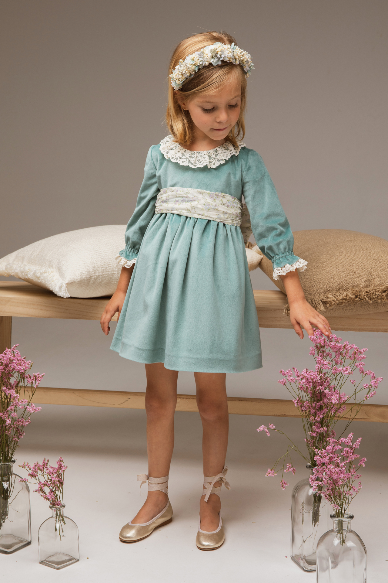 Vestido de terciopelo aguamarina rematado con puntilla en escote y mangas. Lazada de gasa de flores azules funcida.