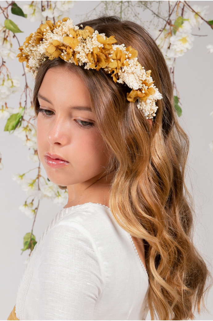 Diadema de flores preservadas en tonos marfilesy mostazas