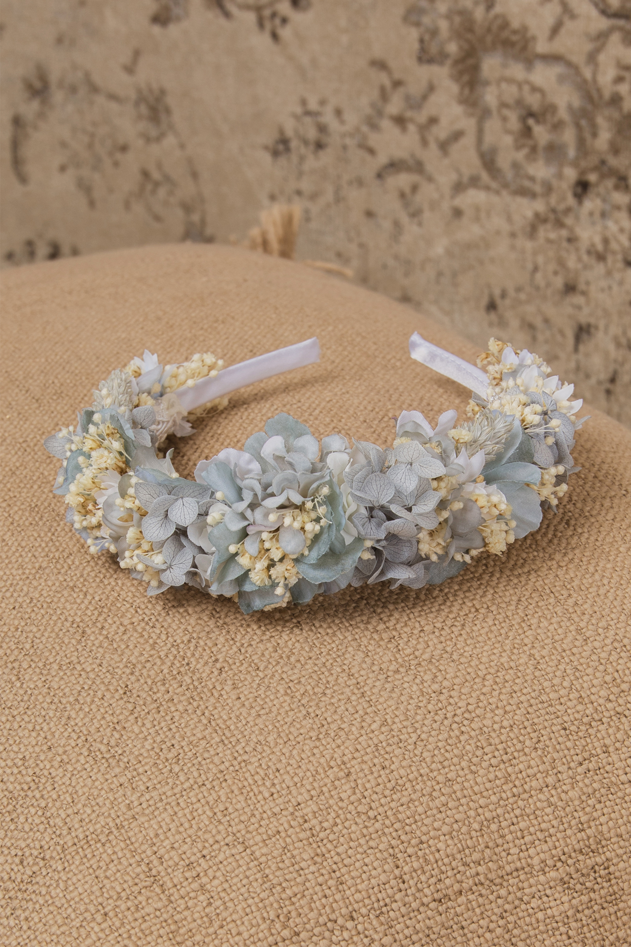 Diadema de flores preservadas en tonos azules y beige con flores de tela en tonos salvia.