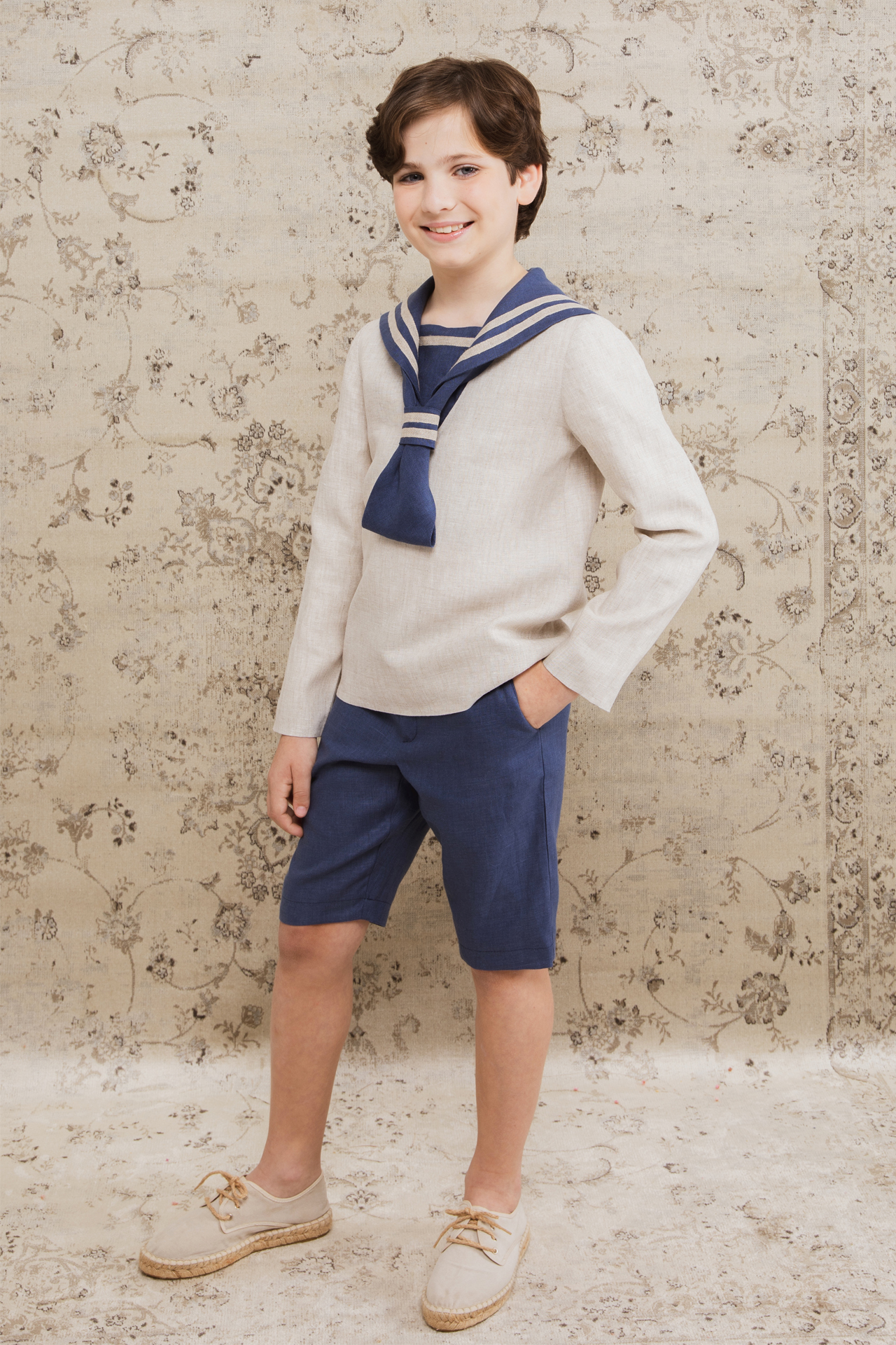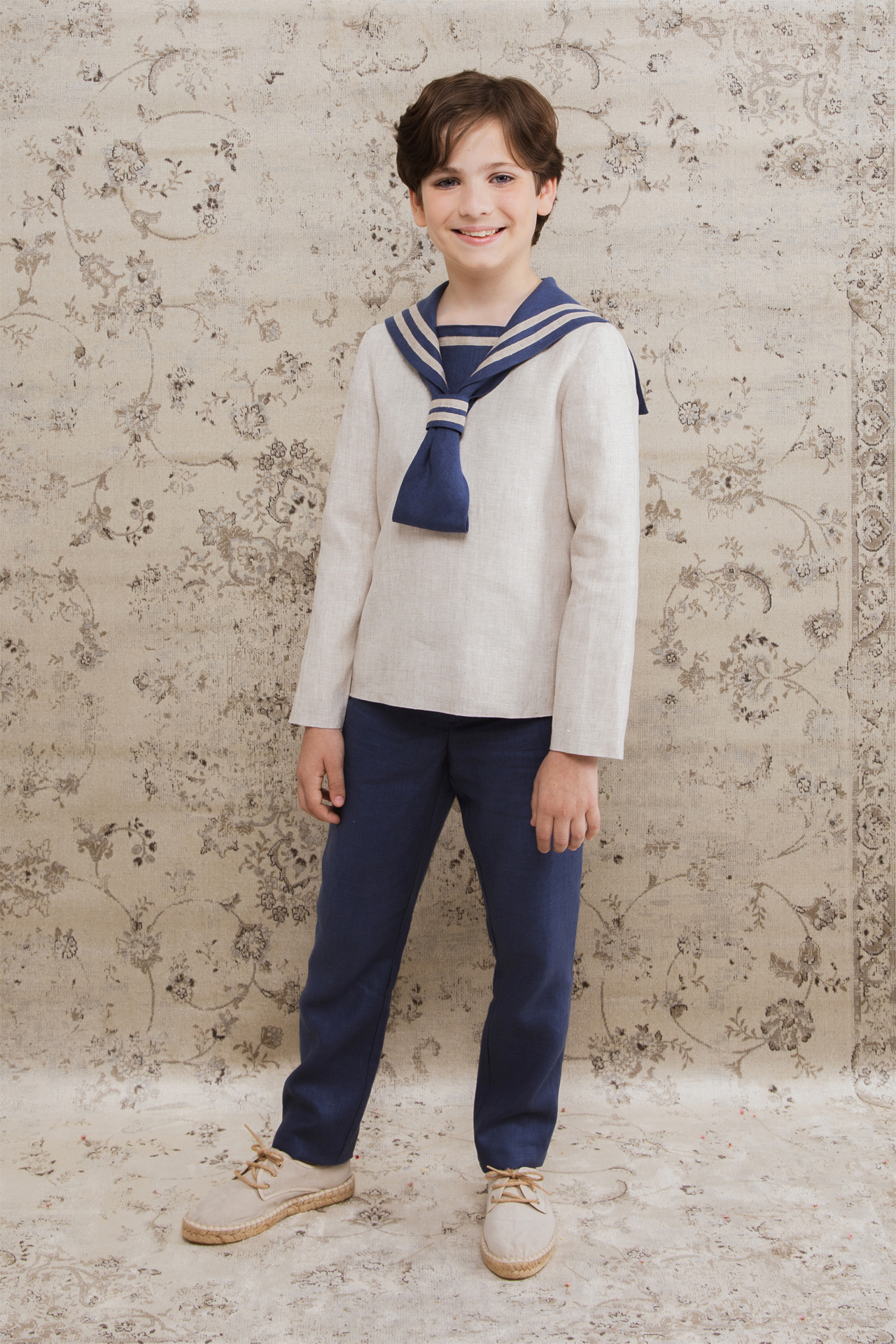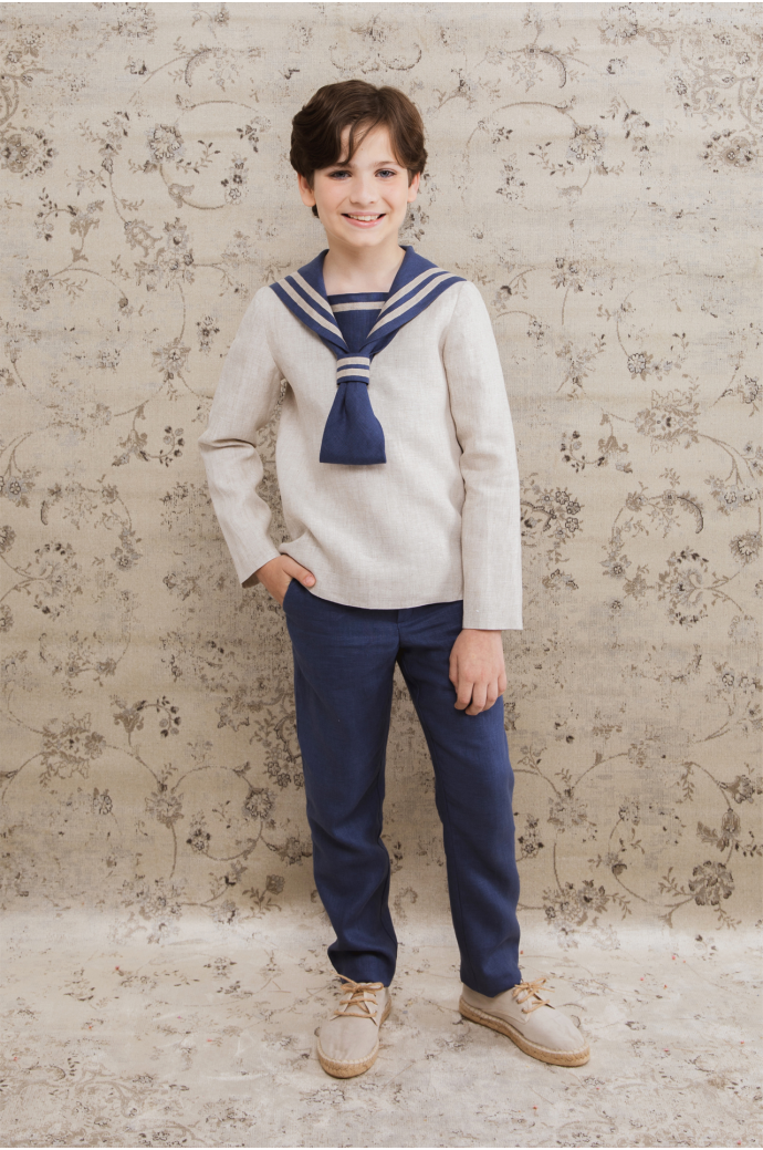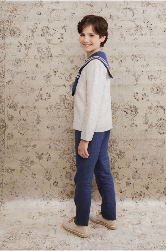 Traje marinero de lino piedra y azul navy, con detalles camel en parte superior.