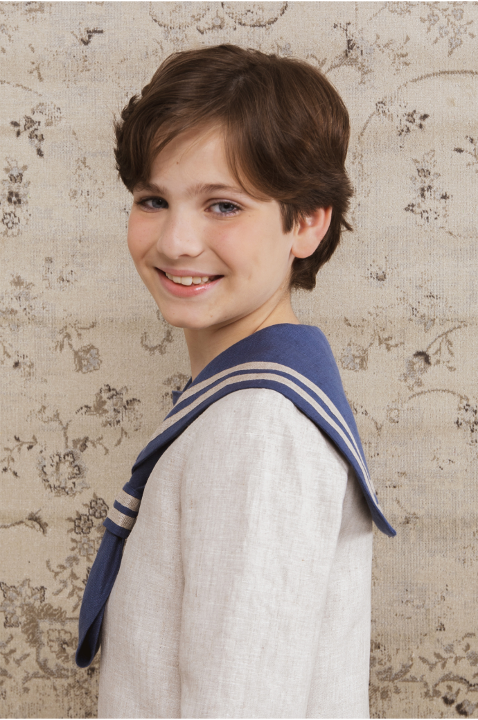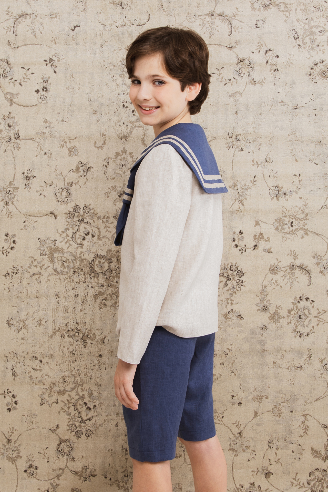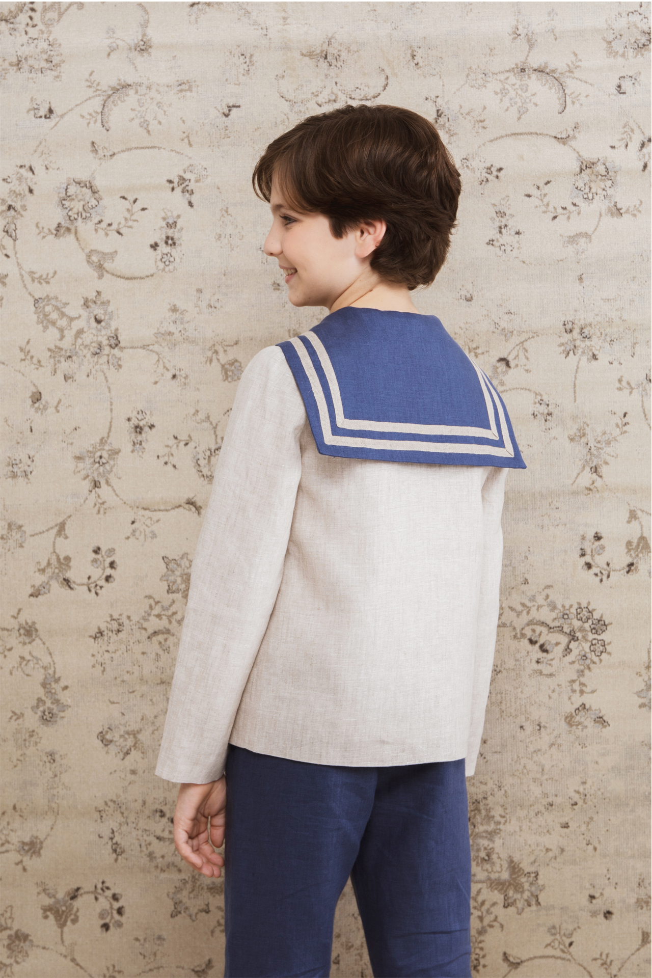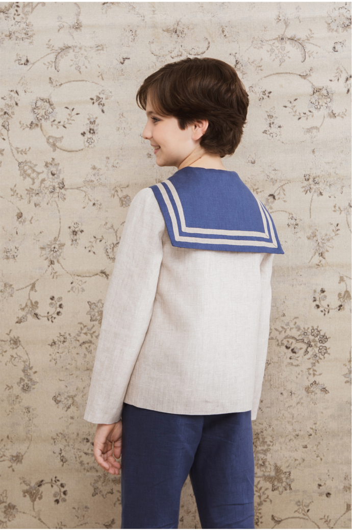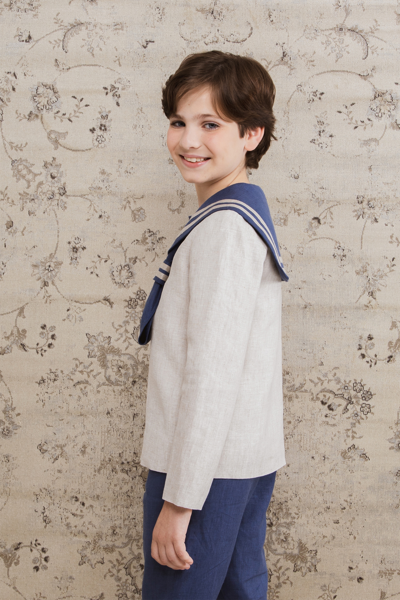 Traje marinero de lino piedra y azul navy, con detalles camel en parte superior.