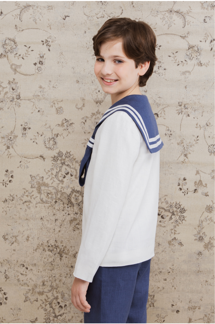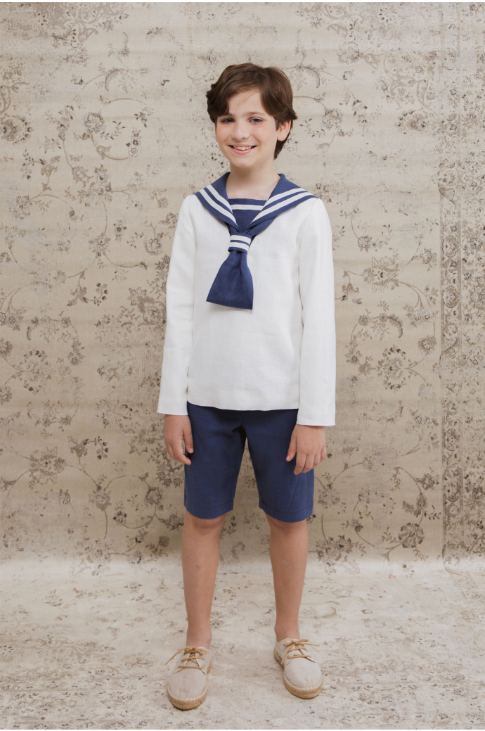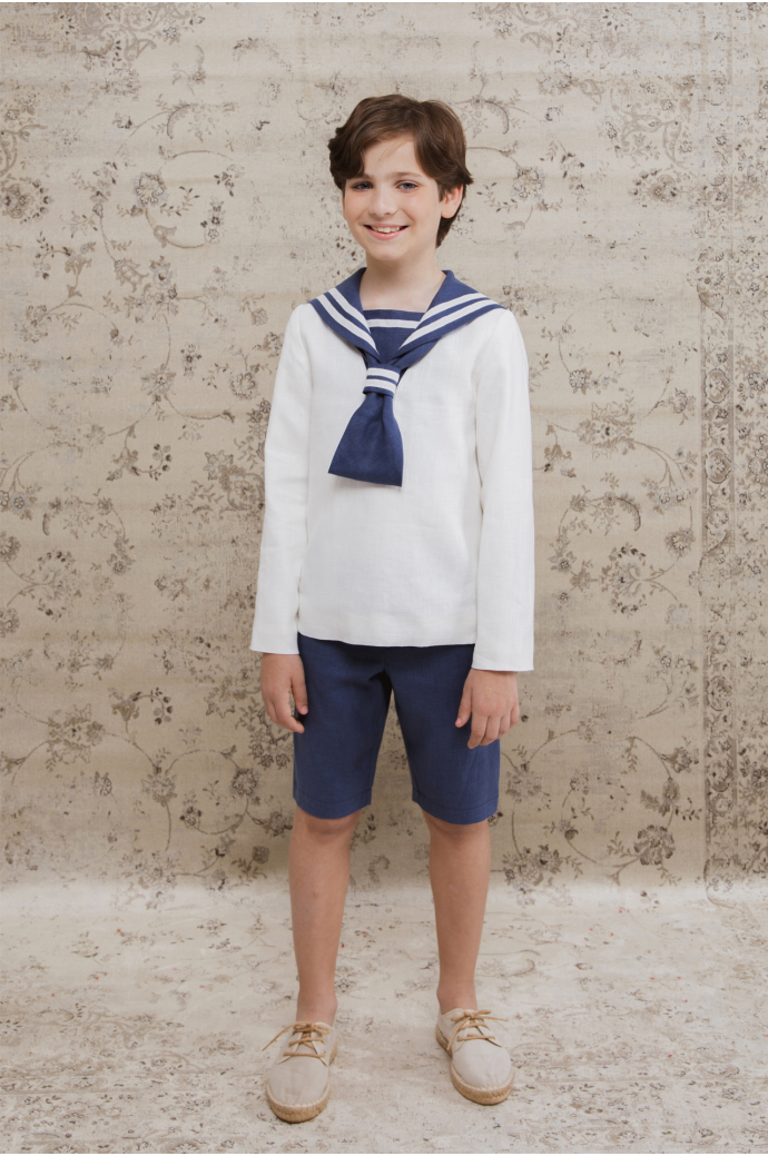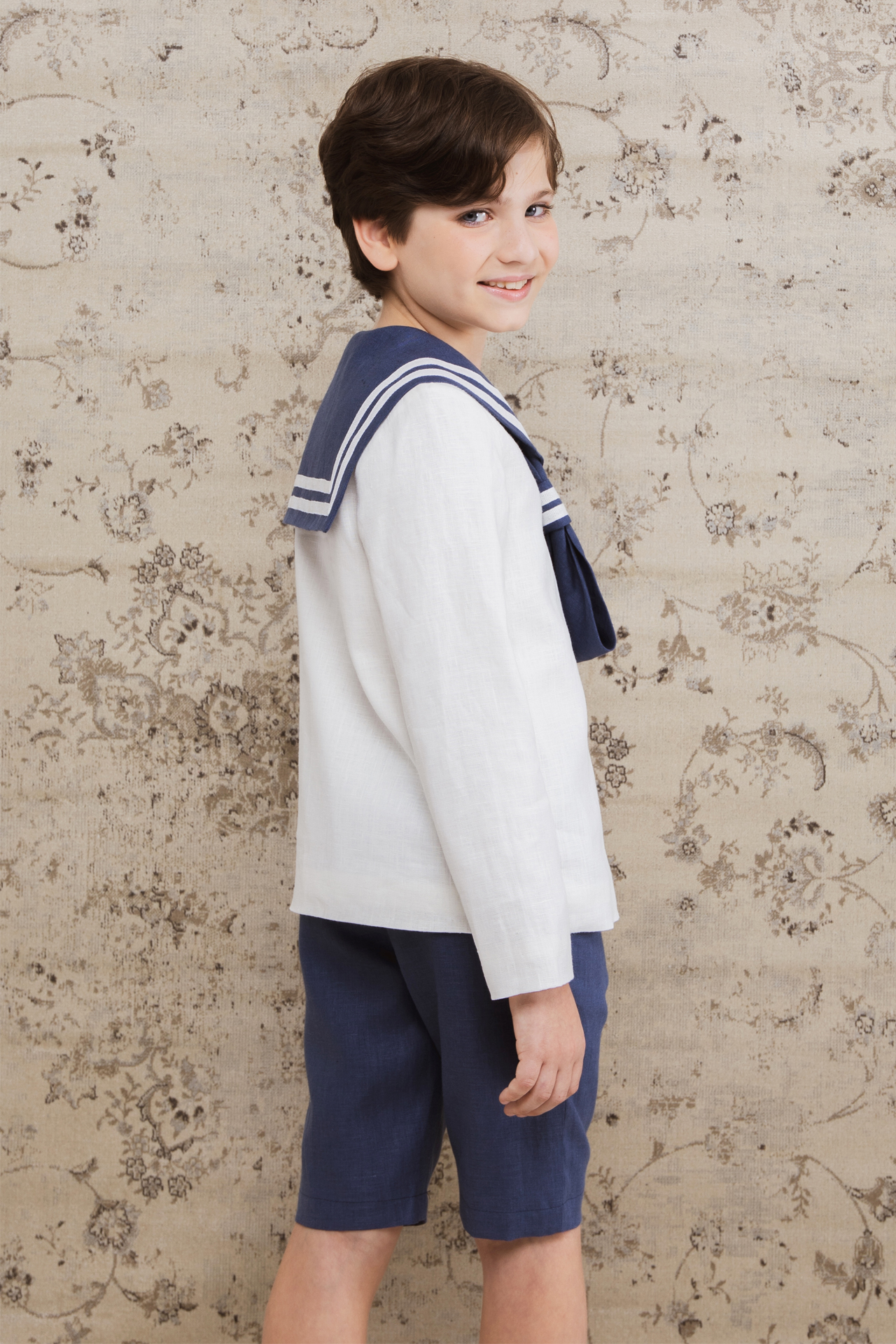 Ivory and navy linen nautical suit with ivory details on the upper part.