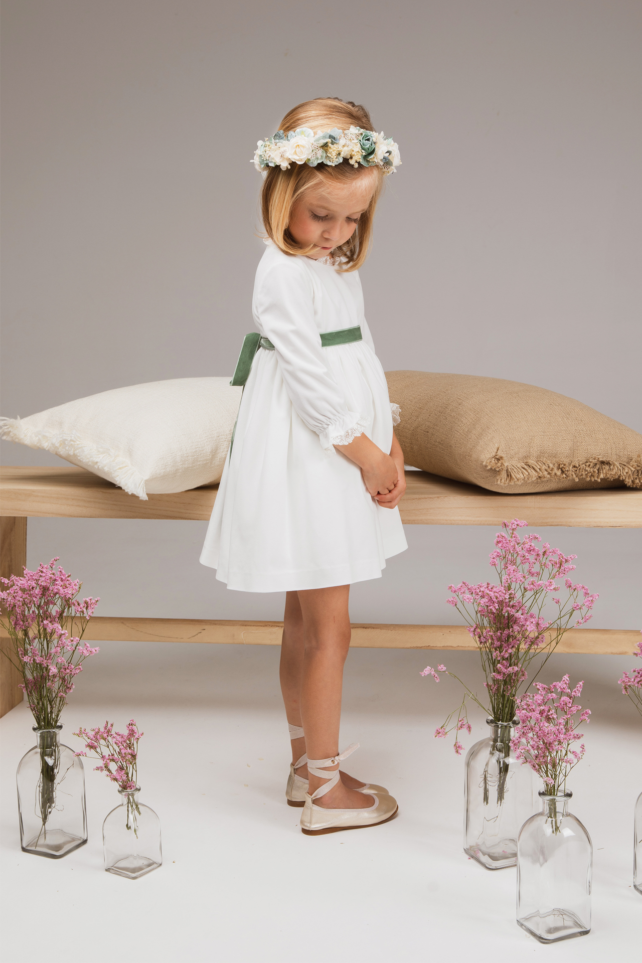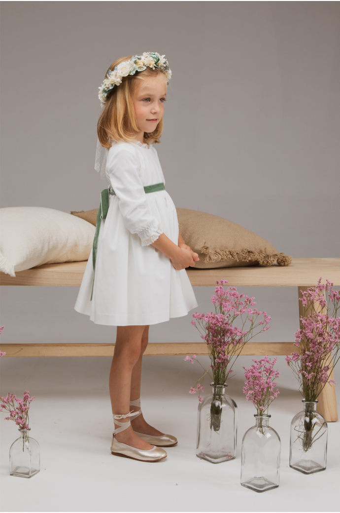 Vestido de tejido algodonero con volantes del mismo tejido en cuerpo delantero, espalda y mangas. Lazada lisa nude en el mismo