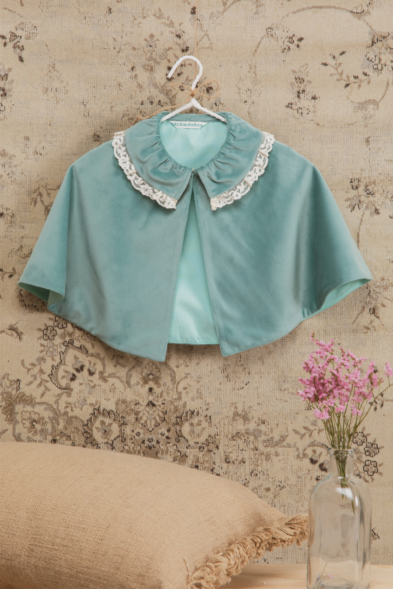 Aquamarine velvet cape finished with lace trim at the neckline.