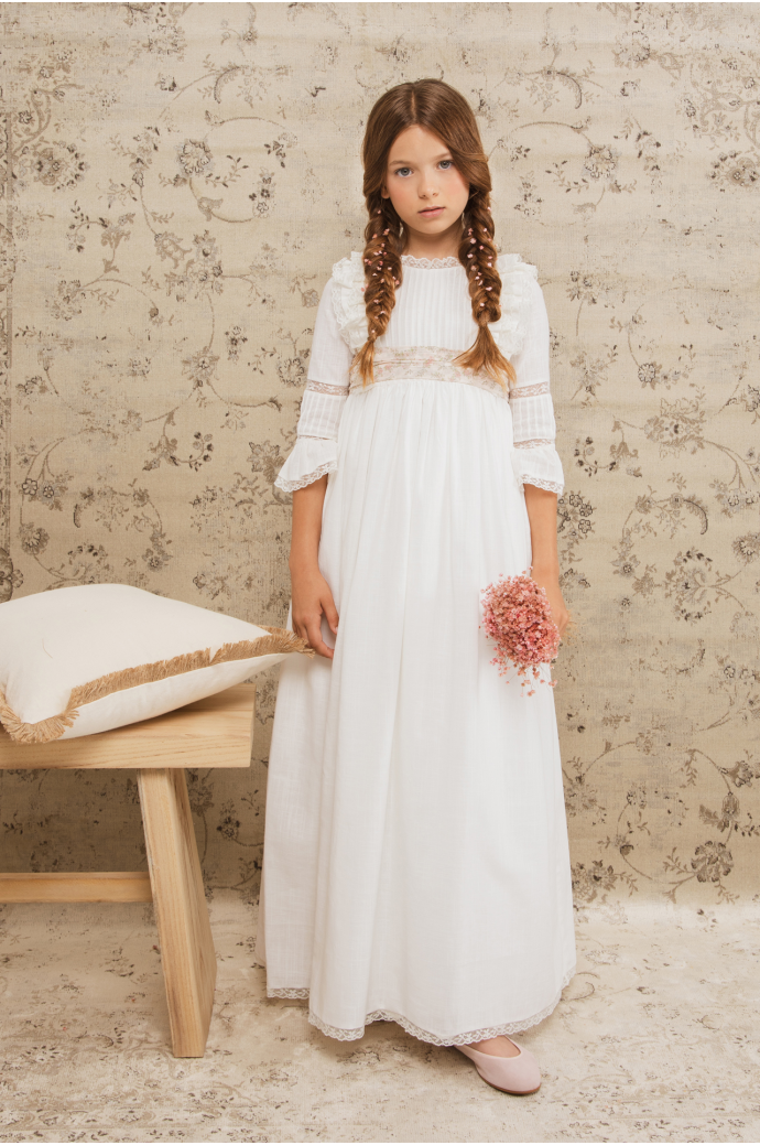 Rustic fabric dress with gathers and ruffles, finished with lace trim at the neckline and ruffles on the bodice.