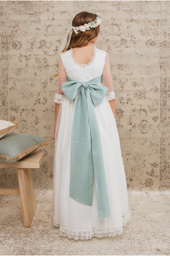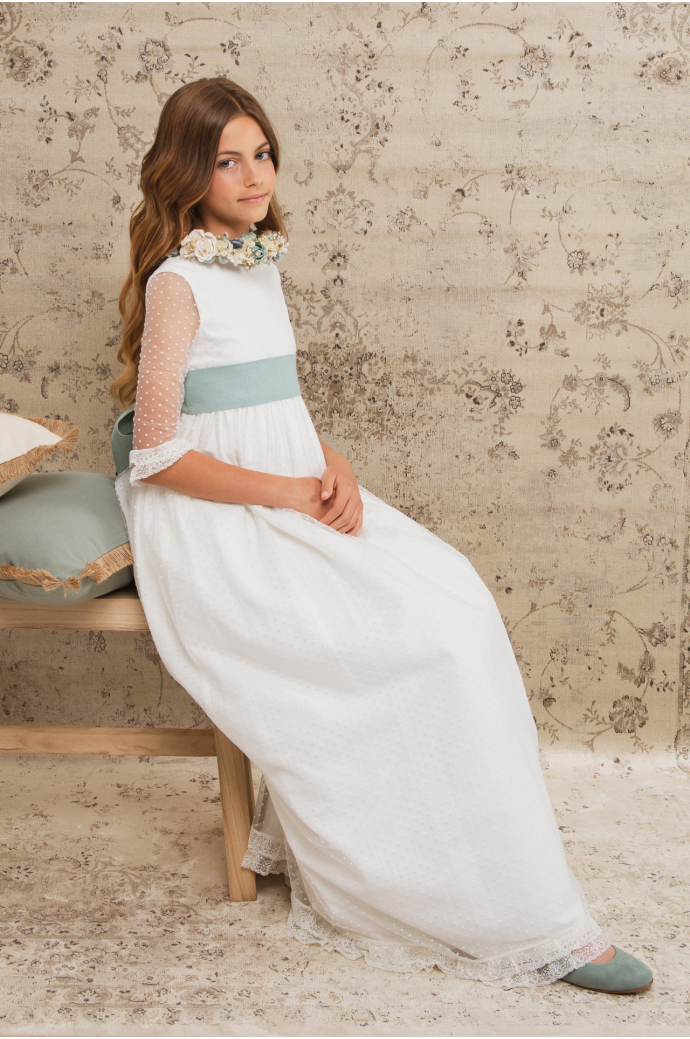 Plumeti tulle dress finished with lace trim on the neckline, sleeves, and hem.