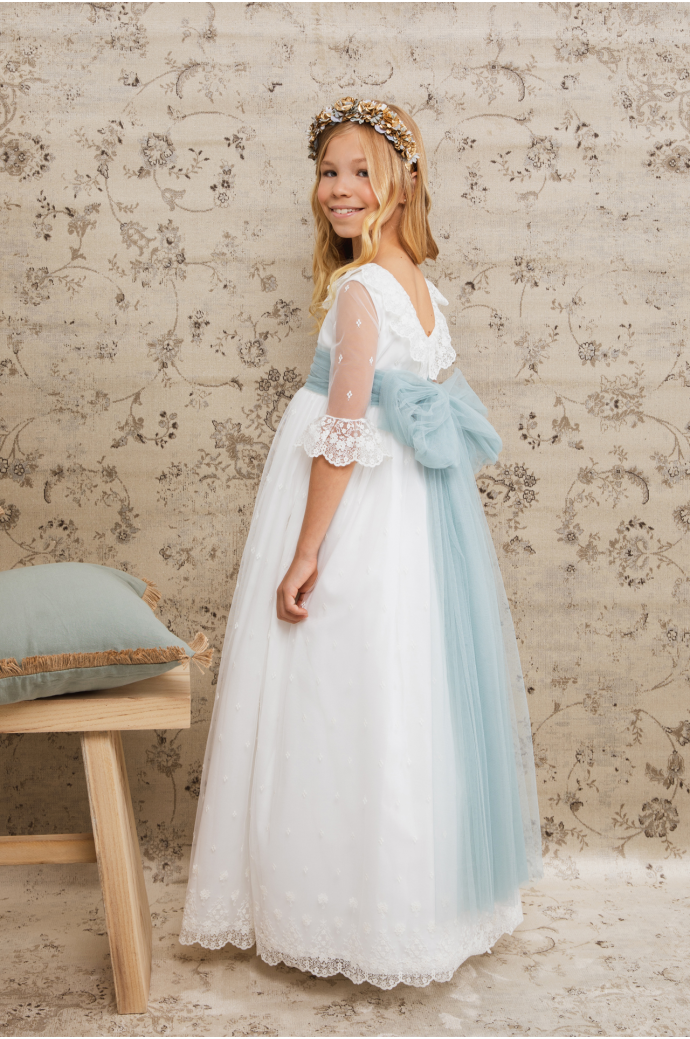 Embroidered tulle dress with tulle trim on the neckline and sleeves.
