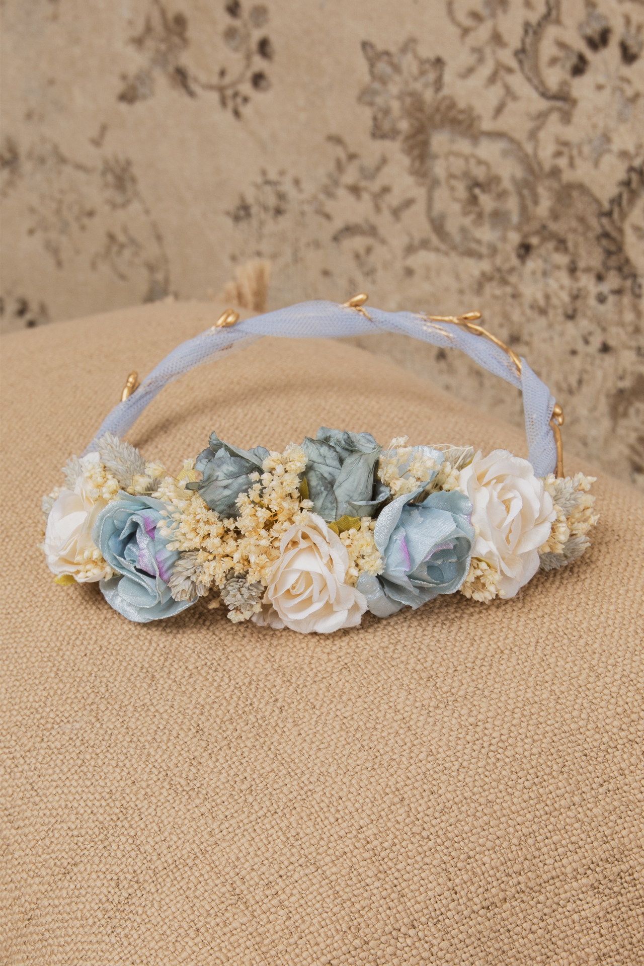 Beige preserved flower wreath with fabric flowers in shades of sea and dusty blue.