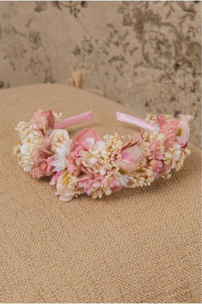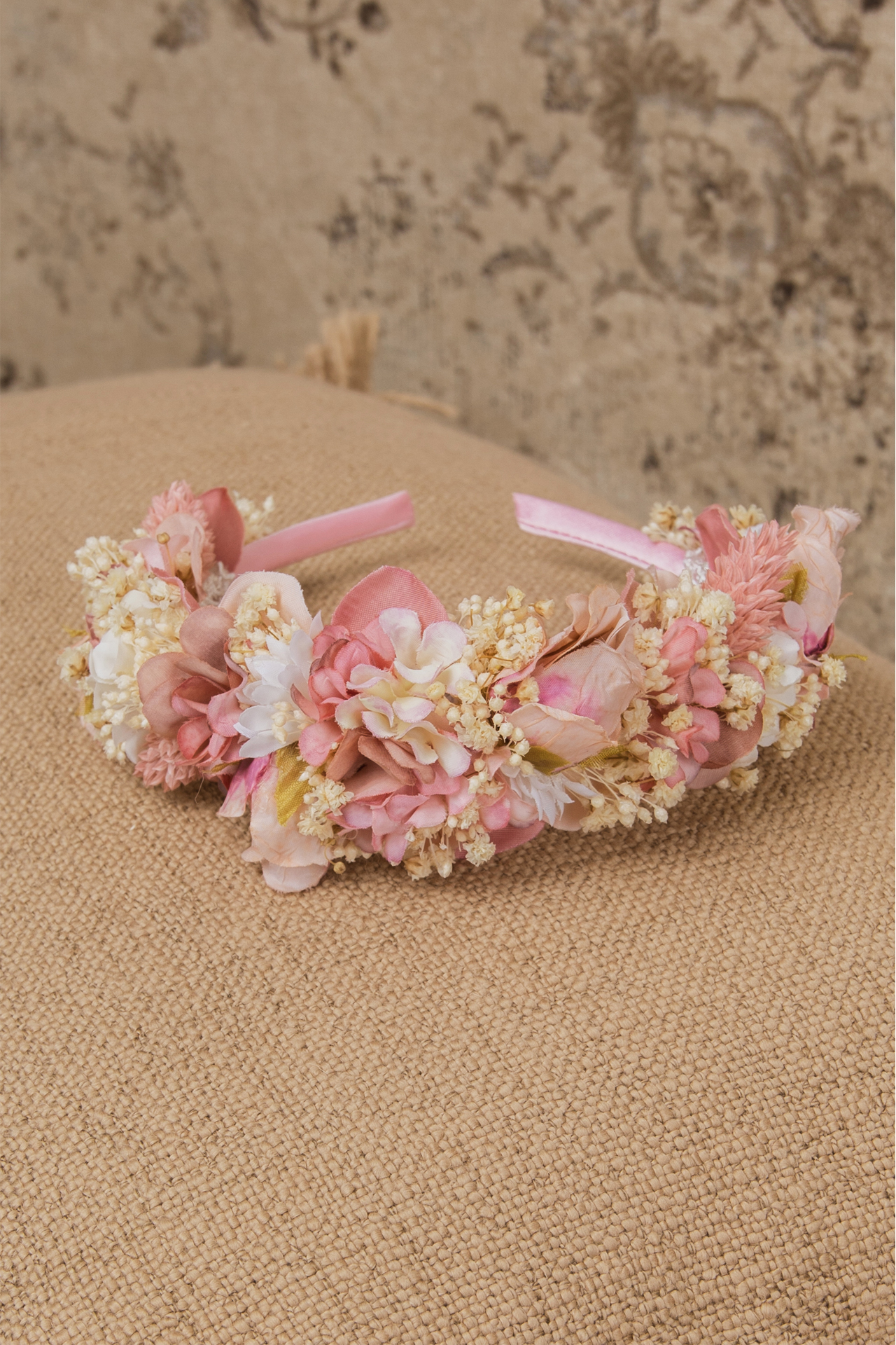 Beige preserved flower headband with fabric flowers in shades of pink and ivory.