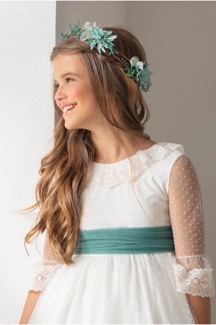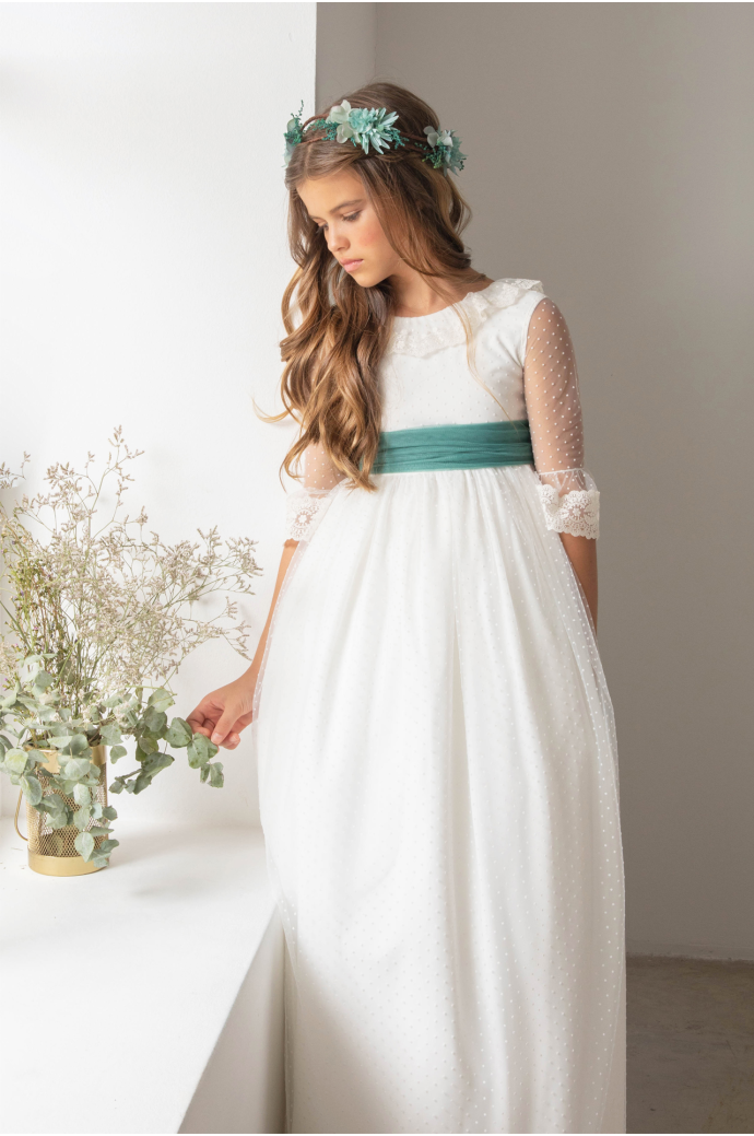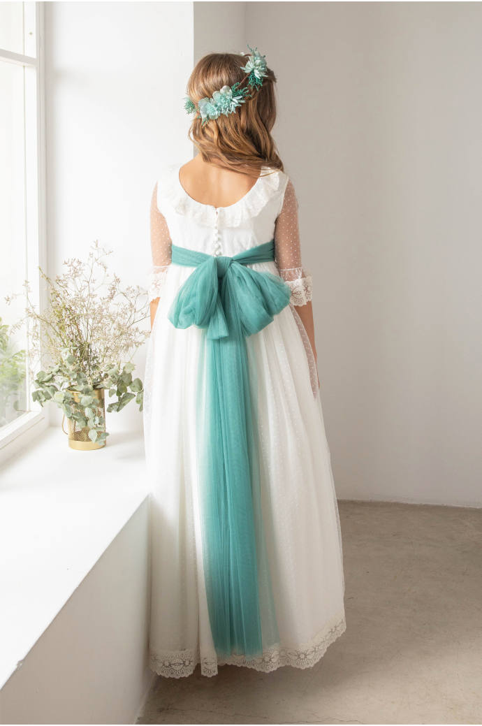 Plumeti tulle dress with embroidered tulle lace trim on the neckline and sleeves. Double aquamarine tulle bow.